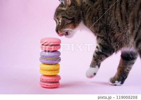 Funny domestic cat sniffs delicious french macaron cakes on pink background.