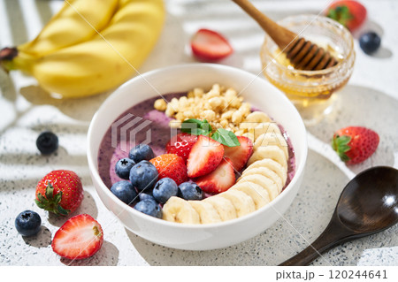 大理石風の背景とカラフルなアサイーボウルと新鮮なフルーツ&ベリー:コピースペース