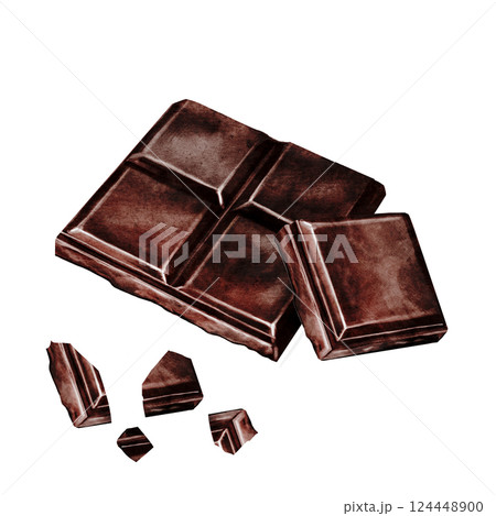 Chocolate bar watercolor composition. Hand drawn pieces of dark chocolate bar on isolated white background. Clip art of sweet dessert. Ideal for logo and packaging of sweets, coffee shop menu and