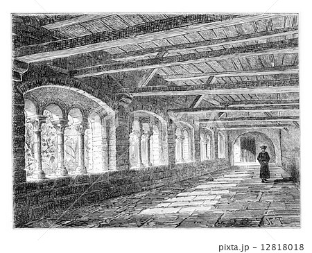 Cloister of the Nivelles Monastery, vintage engraving