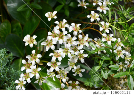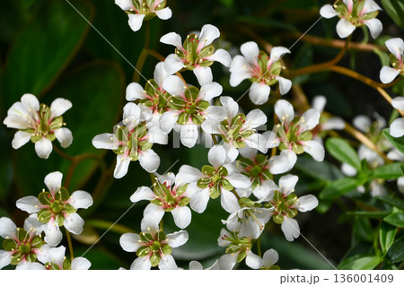春の光を浴びて輝く満開のヒマラヤユキノシタの花