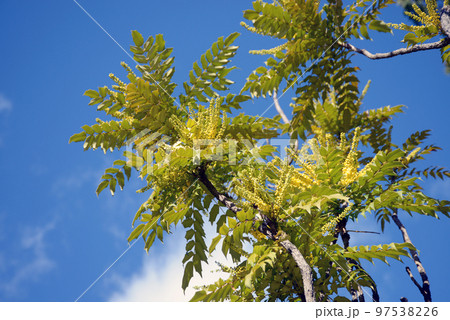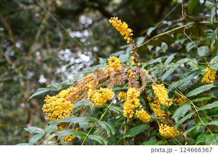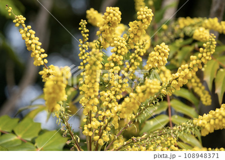 木の枝に緑の葉と黄色い花びらのチャリティという名のベルベリス(マホニア)という花の咲く風景