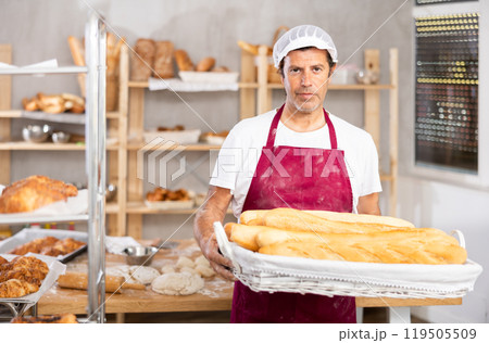 Happy male baker posing with basket of freshly baked baguettes in bakery, demonstrating concept of food industry and baker profession