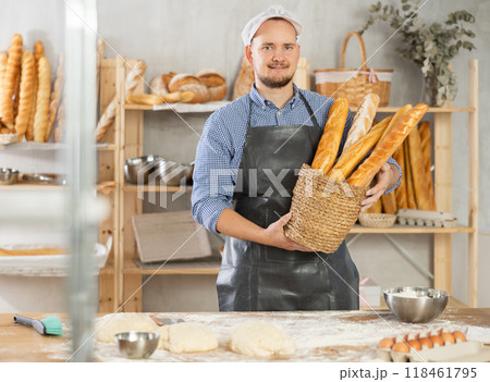 Portrait of young happy male baker working in bakehouse, holding tray with fresh bakery goods on kitchen