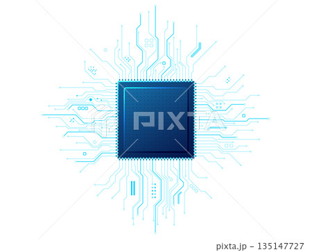 Quantum computing technology illustration, futuristic microchip board with quantum processor on top, glowing data flow and particles, symbolizing high-performance computing and future innovation