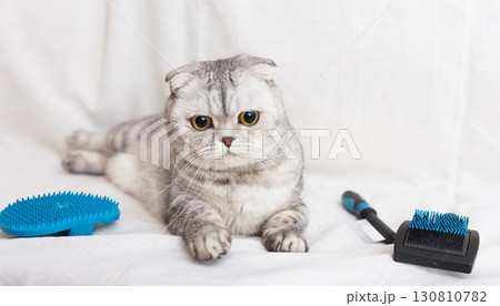 Gray scottish fold cat lying on sofa with grooming combs