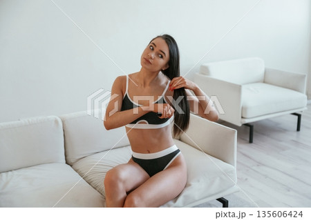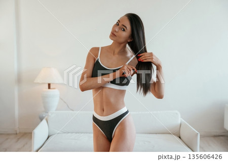 Combs the hair by hands. Young woman with slim body type is indoors