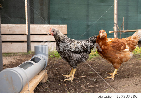 Two hens in a coop: barred rock and rhode island red chickens in farm setting