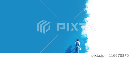 大きな白い壁をローラーを使って空色のペンキで塗る男性