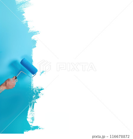 ローラーを持って壁に青いペンキを塗る男性の腕