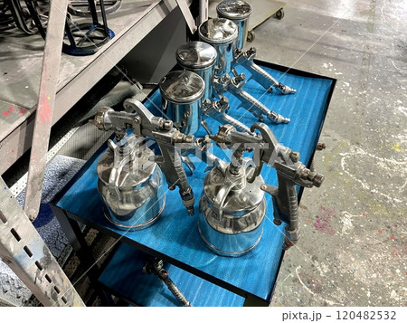 Table in car service with airbrushes for car painting, spray gun in auto repair shop