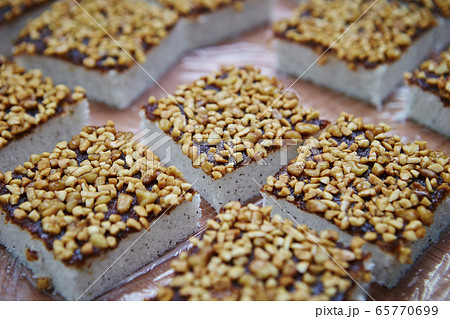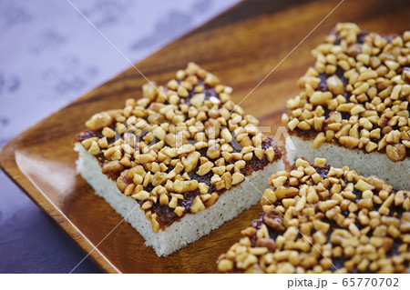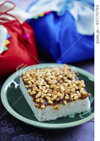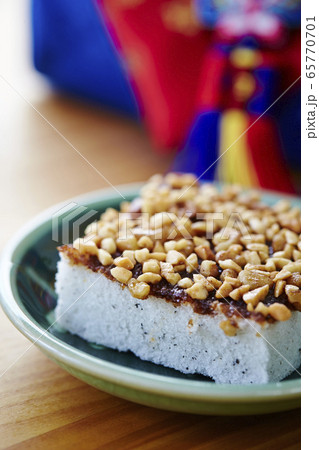 ナッツがトッピングされた韓国の餅菓子