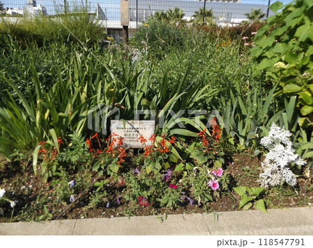 稲毛海浜公園入り口花壇のペチニアとマリーゴールドの花