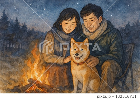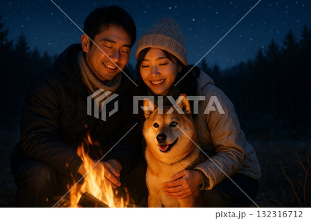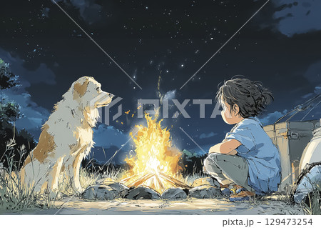 秋の夜、焚き火を見つめる犬と子どもの温かなキャンプ風景
