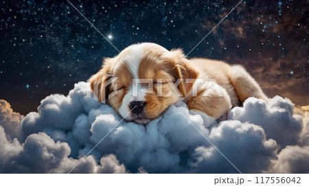 雲の上で眠る子犬、星空に包まれた夢の世界