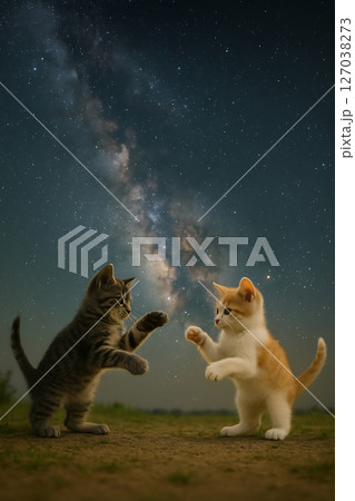 水彩風の天の川の下で遊ぶ2匹の子猫