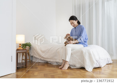 ベッドに座って愛犬を撫でるミドル女性