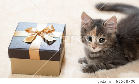 Cute fluffy kitten lies on a cream fur plaid next to a golden gift box