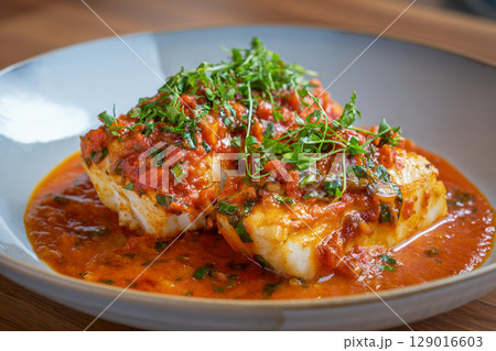Fried Skate in Red Pepper Sauce Topped with Mushroom