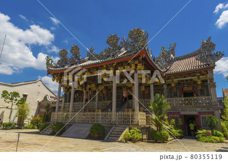 Exterior view of Leong San Tong Khoo Kongsi clanhouse against blue sky in Penang, Malaysia