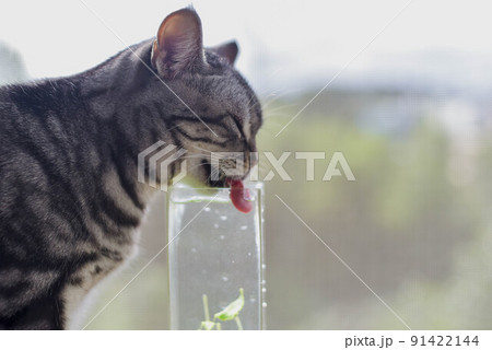 斜め上を見上げて網戸を舐める猫 舌出し顔アップ