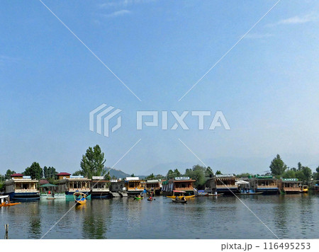 インド北部のカシミール特別州の州都シュリナガールのペワ湖に浮かぶハウスボート