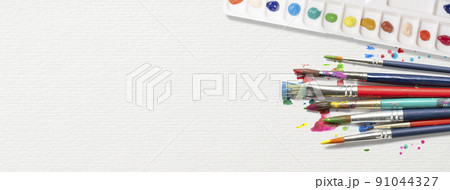 Still life with blank paper, brushes and jars of watercolor and gouache paint