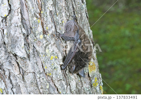 幹で休むホオヒゲコウモリ(北海道・鶴居村)