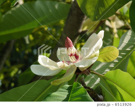 初夏の樹花・雌蕊が赤いホオノキの花・横位置