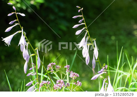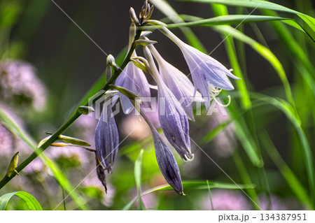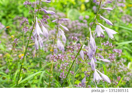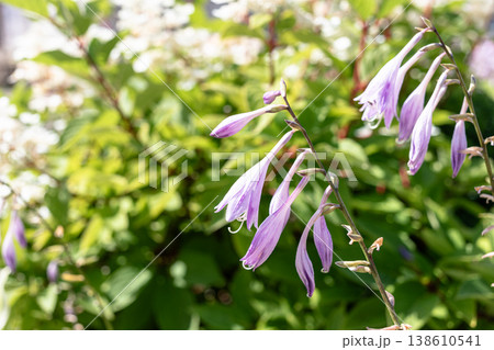 Hosta flowers blooming in a lush green garden showing delicate purple petals