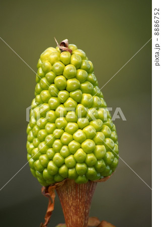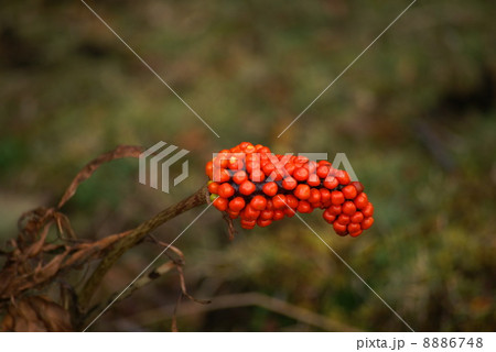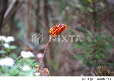 赤く色づいた「マムシグサ」の肉穂花序(にくすいかじょ)