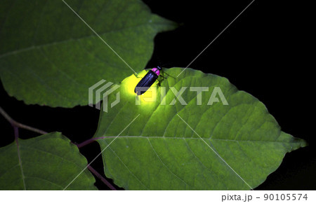 【夏イメージ】葉っぱに止まって光を放つホタル