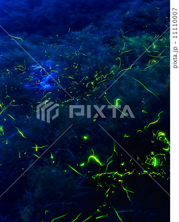 健康の森公園で緑色の光を放つ美しいホタルの初夏「合成」