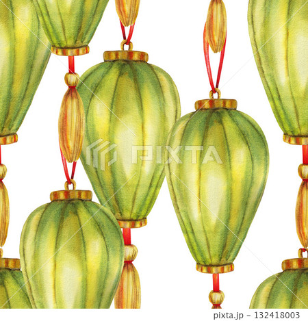 Green Chinese paper lanterns, silk brushes Seamless pattern. Lantern festival Watercolor illustration. For tea party design, travel books and maps, greeting cards, clip art, stickers. Asian tourism.