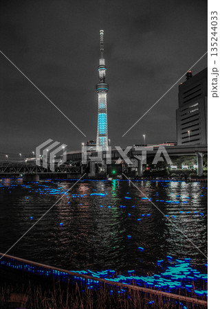 東京スカイツリーと隅田川を流れる光(東京ホタル)