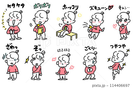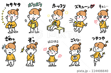 漫画風 様々なポーズと表情の女性 擬音語 オノマトペ 効果音 シンプルで可愛い線画イラスト