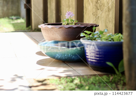 睡蓮鉢が並ぶ涼しげな中庭 日本の夏の景色 納涼 夏の風物詩 風流な和と洋の庭の融合