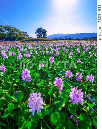 水面に群生して浮かぶ青紫色の花ホテイアオイ