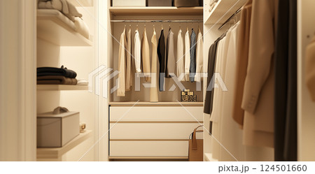 シンプルで洗練されたクローゼット収納 – ナチュラルインテリアの整理整頓された空間
