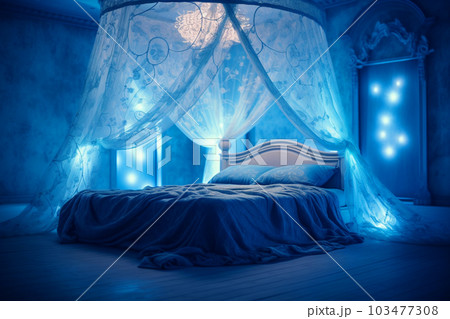 豪華な寝室 天蓋付きのベッド 青色のインテリア