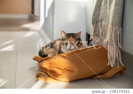 Lazy fluffy cat lies on owner backpack thrown on floor. Always find your comfortable place at home.