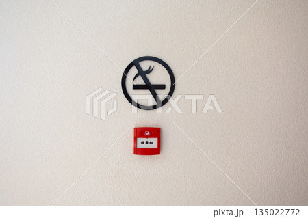No smoking sign above emergency alarm button on interior wall. Public safety regulation, health protection policy and controlled environment inside residential or hotel building