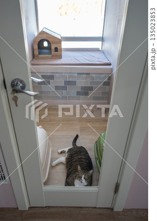 Cat feels sad and lonely in pet hotel room, waiting for owners, look out glass door. Pet boarding
