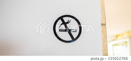 No smoking prohibition symbol mounted on light textured interior wall, banner. Public health protection, behavioral regulation and clean environment policy in residential or hospitality architecture