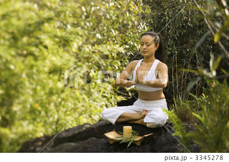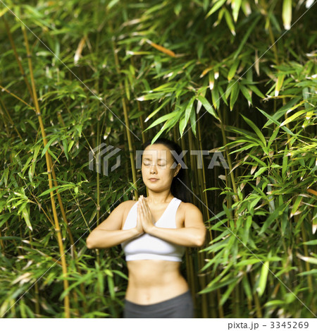 穏やかな笑顔でヨガをするシニアのアジア人女性
