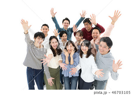 カジュアル 男女 複数 20~40代 斜俯瞰 手を広げる 歓迎 ハイテンション