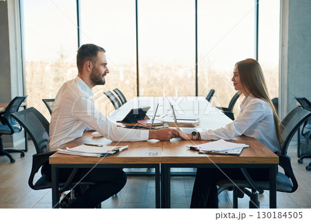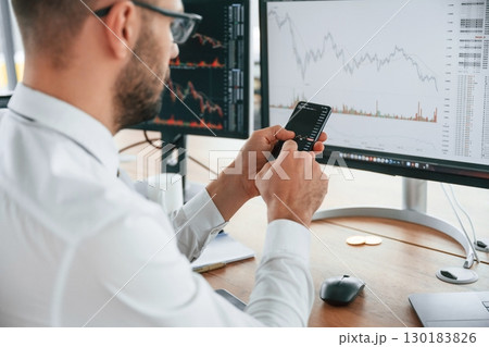 Holding smartphone in hands. Businessman is sitting by computer and working in the office