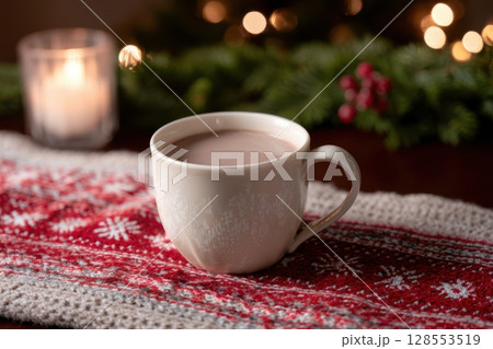 White mug of hot chocolate on festive red-and-white knitted table runner with blurred pine garland and soft candlelight in background, warm cozy Christmas atmosphere