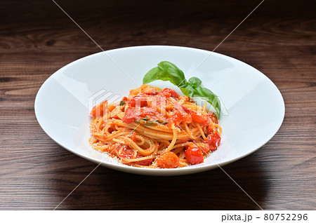 イタリアンパスタ、トマトソースのパスタ、フレッシュトマト使用、バジル添え。
