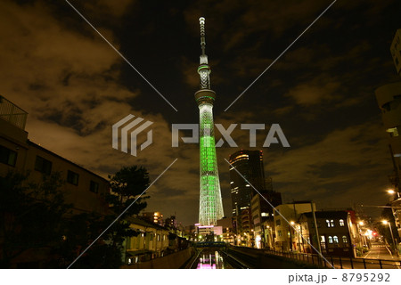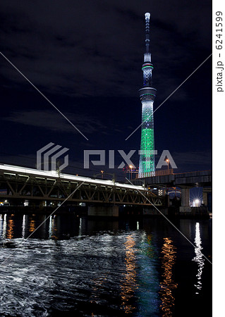 東京スカイツリーの夜景 ライトアップ「ホワイトツリー」 隅田川 縦位置